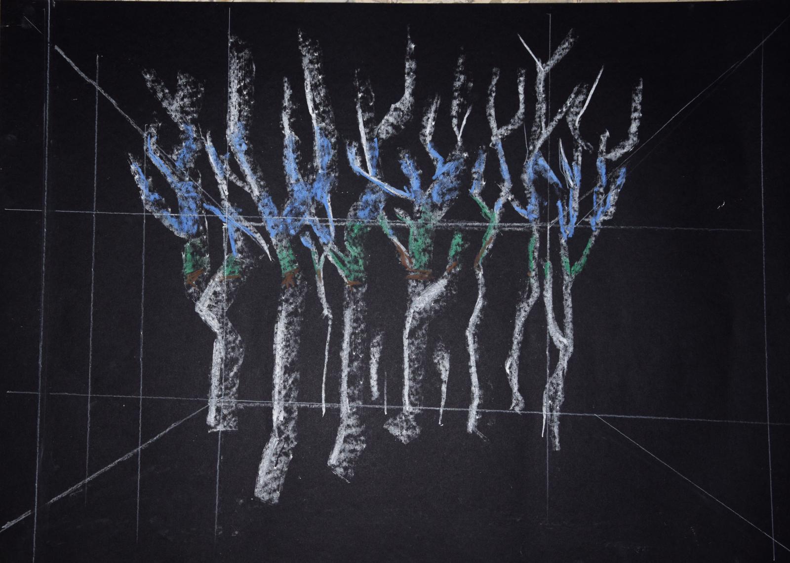 La struttura/opera è stata pensata completamente dipinta di bianco (rispetto a delle quinte tendenzialmente nere) in modo tale che sia possibile proiettare su di essa i video e allo stesso tempo far agire la performance di musica o di danza. La proiezione dei video consentirebbe alla struttura/opera di prendere vita colorandosi dei verdi della natura, degli azzurri del cielo e delle ombre e delle luci del bosco reale. Nell’interazione con il performer-danzatore è stata pensata una struttura su cui sia possibile salire o attraverso la quale si possa interagire con giochi di sovrapposizioni appaio/scompaio. La maggior parte dei materiali lignei sono appesi al soffitto in modo da creare una sorta di bosco rovesciato in grado di suonare tramite lo scontro di un legno con un altro. Questo consentirebbe al performer un’ulteriore possibilità di interazione.